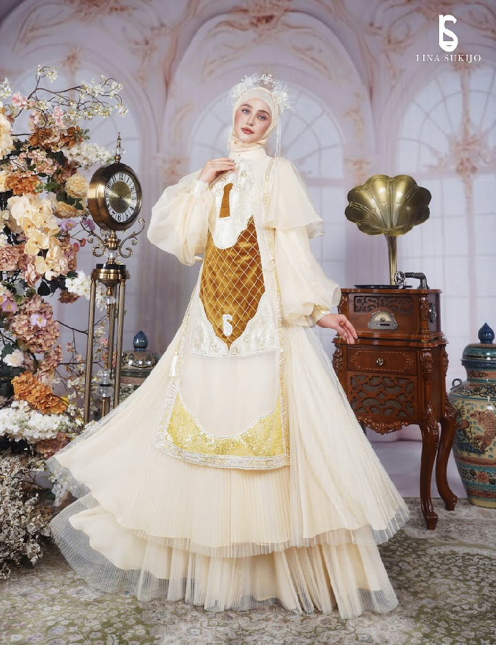 Dari sisi material, Lina Sukijo mengandalkan Jacquard untuk menghadirkan tekstur dan dimensi kemewahan yang kokoh. Sementara Organdy Sutera dan Tulle memberi efek transparansi yang ringan dan ethereal. Kilauan sequins serta taburan kristal Swarovski di berbagai bagian busana mempertegas karakter glamour khas Lina Sukijo, menghadirkan efek berkilau yang hidup di setiap gerakan.