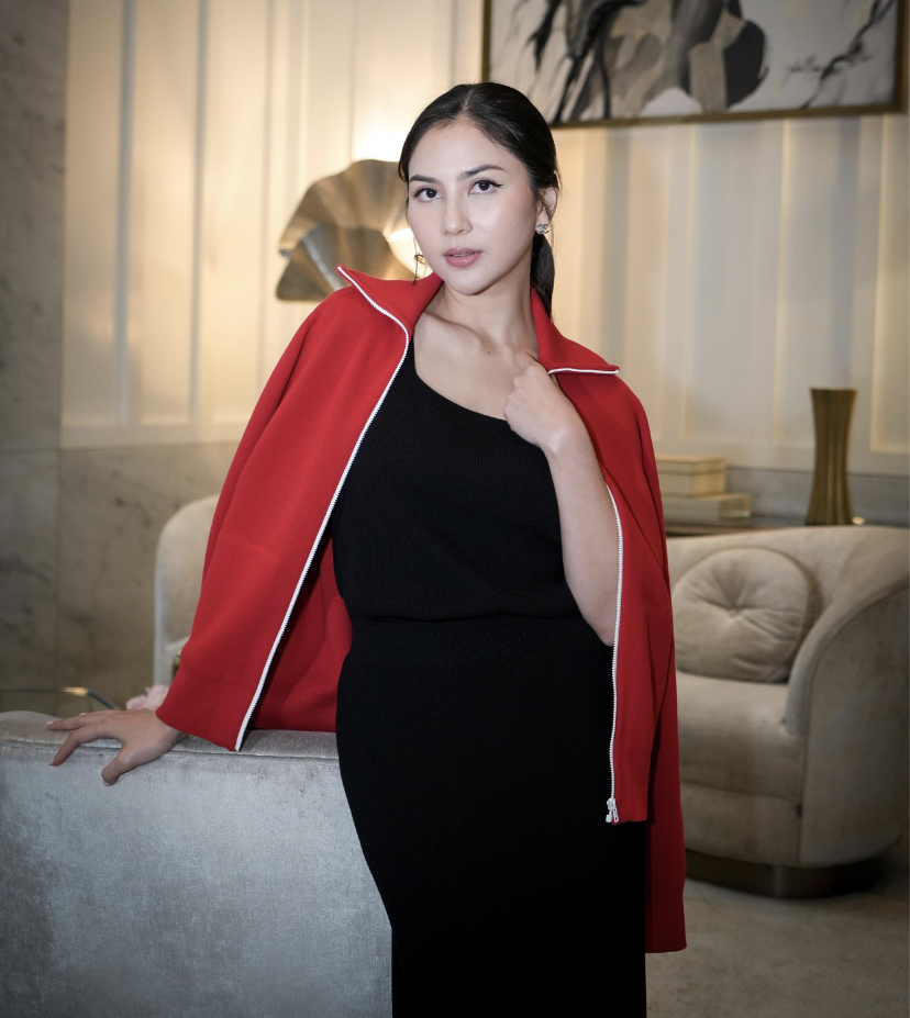 Jessica memperlihatkan spektrum gaya yang luas dalam satu koleksi. Untuk smart casual yang berkarakter, ia memadukan Jaket Tailored bernuansa kalem dengan Cardigan Milano Rib Ritsleting merah terang dan Celana Lebar Rileks—kontras warna memberi statement tanpa terasa ramai.